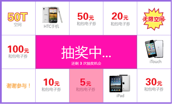 目前,和彩云无限空间活动一上线,即受到用户大力追捧,且参与用户数量仍在成倍增长。通过随机调查获知,众多参与抽奖的用户已获得50T永久免费容量,还有不少用户抽到了iPad4(16G)、iPod touch 5(32G)、HTC手机以及100—5元不等的手机电子支付券……