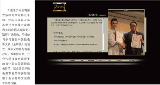 8MM成立于2009年,最早是栏目的形式 ,后来跟广东电视台合作了一档八毫米栏目电影 , 在全国掀起热潮,各大电视台纷纷找来合作 。目前活跃在银屏上的有四个卫视、十几家省级影视频道和300多家地方台 ,组建了电视联盟的播放微电影的平台。再后来因为网络互联网的兴起 ,又建立了互联网的平台 。最后根据市场需求八毫米注册了一家专门播放和微电影交易的网站。经过两三年的转变从传统的电视媒体转向依附于别的大众的互联网 ,再到自己建有自己的互联网站 ,以及我们的PC端口 ,还做了一个八毫米微视频端口,可以分享到平台全世界的人都能看到。也可以放到朋友圈。从宏观来讲以后视频系统还有微电影是个大的发展趋势 首先文化产业是国家大力扶持的,其次文化化产业跟互联网相结合的方向越来越凸显 ,还有受众群体大多为年轻人 ,他们是消费主流市场, 消费能力可以维持5到10年。可以发动广大群众一起做事情,未来的平台越大,就越可能发展成产业链的形式,还可以降低实现电影梦的平台, 粉丝文化影响 ,能为年轻人提供更多就业机会。 也是创造价值财富的一个窗口。