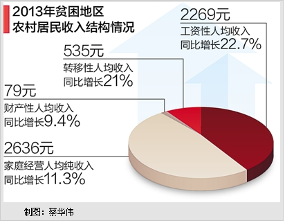 贫困地区包括国家扶贫开发工作重点县和集中连片特困地区。数据表明,这些地区农民收入的增长首先得益于非农就业机会的增加。经济结构调整和产业转移促进了贫困地区的工业发展,为贫困地区带来了就业机会的增加。随着非农就业比重的提高,以及工资水平的较快上涨,2013年贫困地区农村居民工资性收入实现增长22.7%,对全年增收的贡献率达到53.3%,成为贫困地区农村居民增收的主要来源。