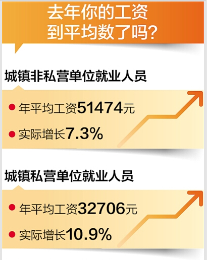 2013年平均工资主要数据显示,全国城镇非私营单位就业人员年平均工资为51474元,与2012年的46769元相比,增加了4705元,同比名义增长10.1%,增幅回落1.8个百分点;全国城镇私营单位就业人员年平均工资为32706元,与2012年的28752元相比,增加了3954元,同比名义增长13.8%,增幅回落3.3个百分点。