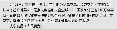 (本报记者 余荣华 王昊男)没有华美的开幕式,第三届中国(北京)国际服务贸易交易会(京交会)5月28日起在北京举办。记者走访京交会现场的峰会、展会和交易磋商现场,深刻感受到,服务贸易正成为锻造中国经济又一强劲引擎的梦工厂。