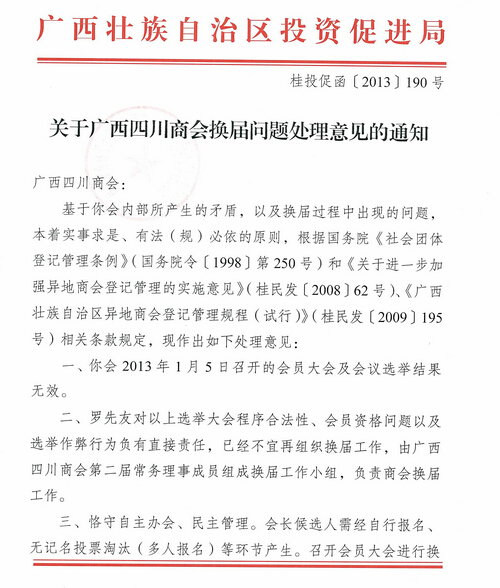 2013年12月29日,经广西壮族自治区促进局(桂投促函[2013]510)号文件批准,广西四川商会第三届换届选举会员大会顺利召开,200多名会员和南宁成都商会、北海四川商会、桂林四川商会、柳州四川商会、玉林川渝商会、百色川渝商会、凭祥川渝商会和东兴四川商会等广西各地四川(川渝)商会团体代表、南国雄鹰律师事务所蓝中华等两名见证律师参加了会议,会议无记名投票选出了以广西和润集团董事长李润先生为会长的领导班子。