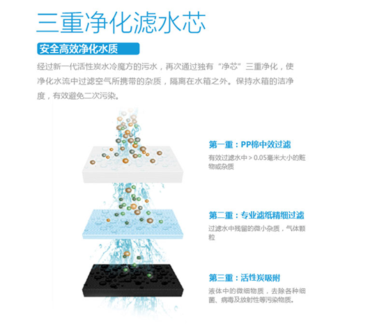 为了防止空调扇内部水循环系统的二次污染,经过新一代活性炭水冷魔方吸附空气污染物形成的污水,将通过独有的“净芯”完成三重净化,使净化水流中从空气中截留的杂质被隔离在水箱之外,从而保持水箱的洁净水循环。