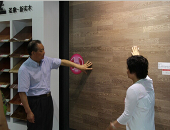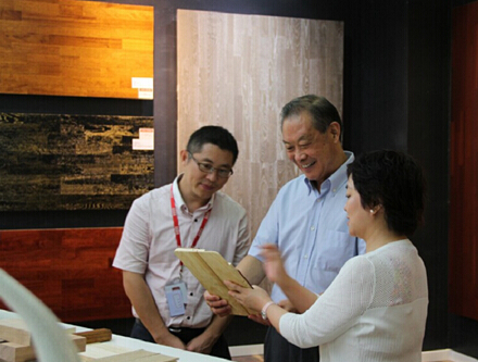 2014年7月20日上午,在圣象集团副总裁、圣象康逸事业部总经理朱玲英及公司管理团队的陪同下,大亚集团董事长陈兴康及领导们一行走进圣象三层实木新品馆,现场体验圣象三层实木“无缝隙、可搬家、抗变形、会呼吸”的产品特点,观看了圣世名匠的品牌故事、圣象三层实木地板V5、V6、V7新品故事视频,并认真听取了关于圣象三层实木地板总体情况、新产品研发、公司未来发展目标等内容的汇报。