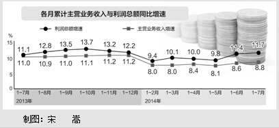一是随着国家一系列“稳增长”政策的实施,企业销售保持稳定增长。1—7月份,规模以上工业企业主营业务收入同比增长8.8%,增速比上半年提高0.2个百分点。