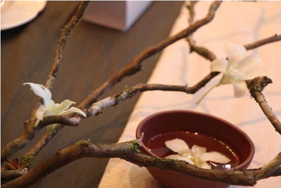 (从云南景迈山空运至莞的百年古茶树干支点缀茶席)