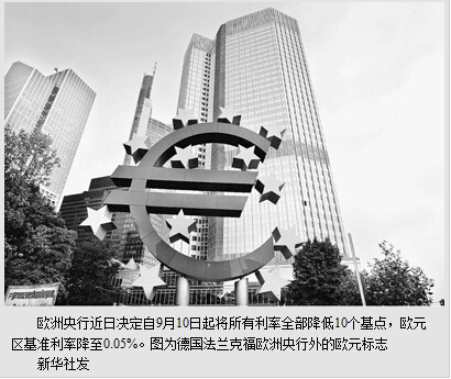 欧元区经济停滞不前,失业率高企,通缩趋势越来越明显。近日,欧洲央行决定自9月10日起将所有利率全部降低10个基点,欧元区基准利率降至0.05%,同时出台一揽子资产购买计划,以提振经济。欧洲央行推出新宽松计划足见其对低通胀率、疲弱的通胀预期以及下滑中的欧元区经济的担忧,而其多项调控政策最终能起到何种作用,仍有待时间检验。