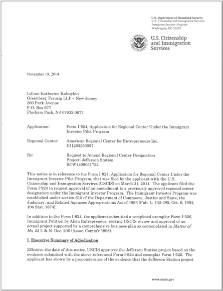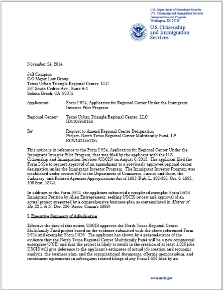 日前嘉德移民重磅推出的TDI一期及二期项目无论是地理位置、还款担保还是就业人数等,都保障了投资人的绿卡获批和投资款的归还,同时也最大限度地保护了投资人利益。目前TDI系列项目已经在移民局获得了良好的口碑,并且项目已经得到I924批准函,I-526申请也将会按照移民局正常的审理时间进行签发。(附件附上TDI一期的I-924项目获批函以及TDI二期的I-924获批函)