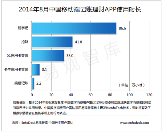 在中国记账理财APP的月使用时长中,随手记系列产品月使用时长总和已达到94.7万小时,已经超过整个品类其它产品月使用时长的总和。