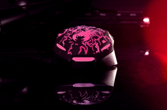 天王蝎的灯光效果属于自然柔和的散射光源,而非单独LED灯管直接照射。这种特制LED灯在保证了光的温和特性同时持续输出渐变光源,通过灯本体的散射和鼠标内部的漫反射,让天王蝎的每一条镭雕纹理都清晰自然,呼吸灯特效的加入为鼠标的整体评价加分不少。