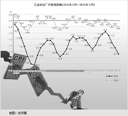 姚景源:经济学界普遍认为,当CPI连续3个月以上或连续两个季度出现负增长,可以认定为出现通货紧缩,简称通缩。从目前的数据看,我们还没有陷入通缩。不过,2012年下半年以来PPI持续下降,2014年11月CPI只有1.4%,2015年CPI有可能出现负增长,因此,我们确实要高度警惕通缩压力。