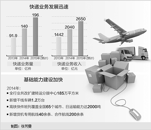 马军胜预计,2015年快递业务量将完成196亿件,同比增长约40%;业务收入将完成2650亿元,同比增长可达30%。