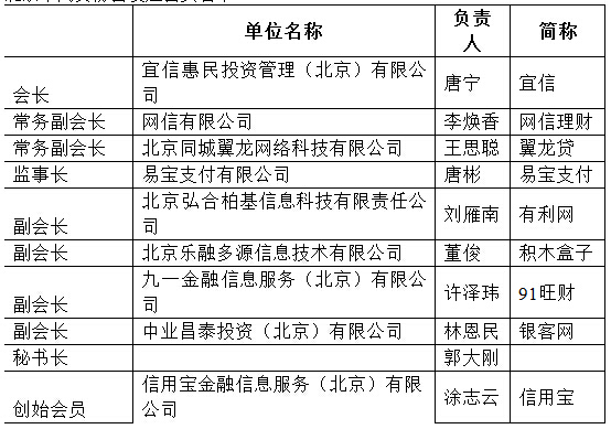 按照会员投票结果,最终选举出了协会第一届理事会和监事会单位:宜信公司当选会长单位,网信理财、翼龙贷当选常务副会长单位,有利网、积木盒子、91旺财、银客网等4家机构当选副会长单位,易宝支付当选监事长单位,协会筹备工作领导小组负责人郭大刚当选秘书长。