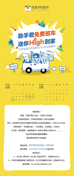 作为春运的第一波主力军的北京高校学子们,伴随寒假到来的一系列各种交通问题也将由百度手机助手发起的“助手君送你high到家”活动得到解决,想要带着大包小包轻轻松松到火车站就即刻预约吧。