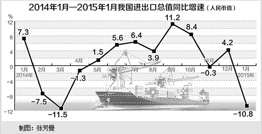 分析1月份我国外贸进出口同比下降的原因,海关总署有关负责人表示,进口货物量减价跌是主要因素。自去年下半年开始,固定资产投资创新低,工业生产疲弱,对大宗商品进口需求持续萎缩,进口下行压力大。同时,由于全球大宗商品价格大幅下跌,进一步拉低了进口值。