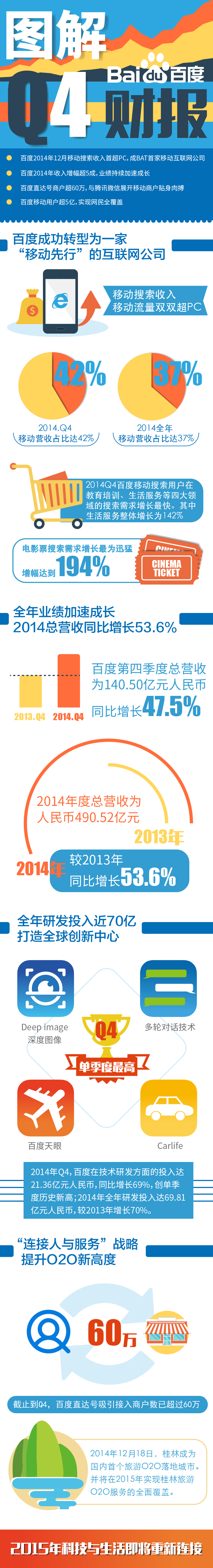 2月12日,百度公布了截至2014年12月31日的第四季度及全年未经审计的财务报告。其中,百度第四季度营收为140.50亿元人民币,较去年同期增长47.5%;2014年度总营收为人民币490.52亿元,较2013年同比增长53.6%。百度第四季度移动收入在总营收中占比已达到42%。