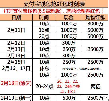 2月9日,支付宝官方微博发布一条消息,称2月11日至19日,支付宝将和品牌商户一起向用户发放约6亿元的红包。并且红包没有任何门槛,只要在活动整点打开最新版支付宝钱包(8.5版本)就可免费拿钱。