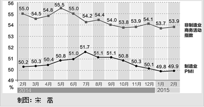 本报北京3月1日电 (记者杜海涛)中国物流与采购联合会、国家统计局服务业调查中心今天发布,2月份中国制造业采购经理指数(PMI)为49.9%,比上月上升0.1个百分点;中国非制造业商务活动指数为53.9%,环比上升0.2个百分点。