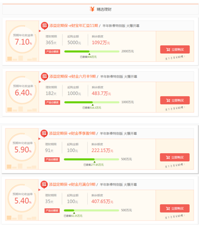 因此,我们以页面第一款产品为例来进行比较。如图,“添益定期保—e财宝年汇益11期”,点击立即购买。