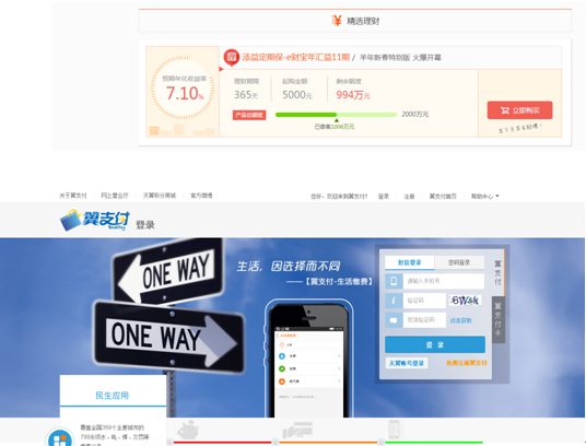 首先,在关键词搜索中输入“翼支付”,打开翼支付官方网站。“添益理财”四个字赫然出现在眼前: