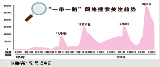 两会召开前夕,“一带一路”持续升温,3月3日百度搜索指数达到最高值。在百度搜索中,以“一带一路”为关键词得到的搜索结果高达582万个,新闻报道有120万篇。