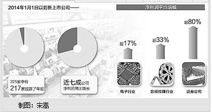 数据显示,2014年1月1日以后新上市且披露年报的公司,2014年实现营业收入合计3338.8亿元,较2013年增11.3%,实现净利润合计364.6亿元,较2013年下降2.8%。