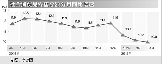4月份,社会消费品零售总额同比增长10%,增速比上月略降0.2个百分点,回落幅度比上月有所收窄。国家统计局高级统计师蔺涛表示,社会消费品零售总额增速虽略有回落,但仍保持平稳增长;而且消费结构不断优化,新兴业态继续快速发展。