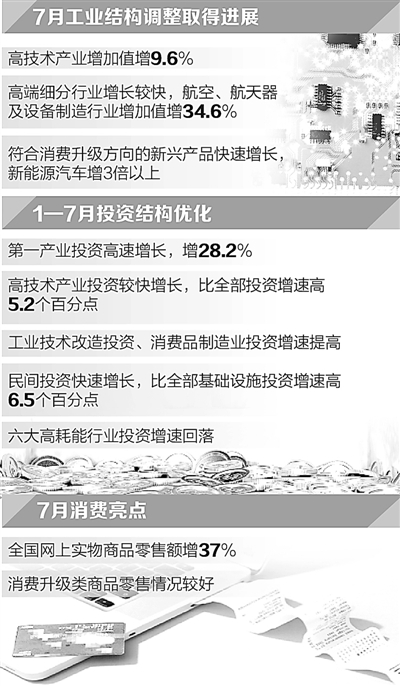 一是高技术产业增加值增长有所加快。7月份,高技术产业增长9.6%,增速较6月份加快0.4个百分点。二是支撑工业转型升级的高端细分行业仍然保持了较快增长。7月份,航空、航天器及设备制造行业增加值增长34.6%;城市轨道交通设备制造增长19.7%;通信设备制造增长15.5%;雷达及配套设备制造增长12.8%;电子器件制造增长13.1%。三是符合消费升级方向的新兴产品快速增长。7月份,在汽车产量总体下降的情况下,运动型多用途乘用车(SUV)增长32.9%,新能源汽车增长3倍以上;动车组增长104.7%;智能电视增长47.1%;智能手机增长31.7%;光纤增长47.6%;太阳能电池(光伏电池)增长21.7%;光电子器件增长21.5%。