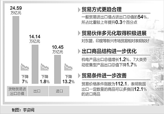 据海关统计,2015年,我国货物贸易进出口总值24.59万亿元人民币,比2014年下降7%。其中,出口14.14万亿元,下降1.8%;进口10.45万亿元,下降13.2%;贸易顺差3.69万亿元,扩大56.7%。