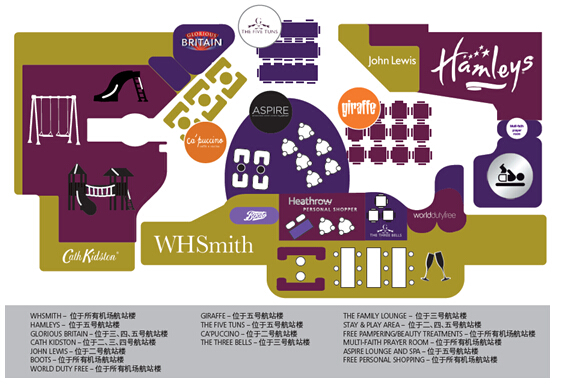 请注意:文中平面图旨在反映出每一类旅客的不同喜好。尽管可能并非本分之百地表现出实际情况,但对希思罗机场各航站楼提供的各家商店和各项服务都进行了很好的展示,通过这些可以知道在机场何处找到目标商店和服务。