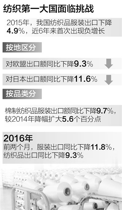 2015年,我国纺织品服装对欧盟出口额同比下降9.3%,对日本下降11.6%;与2008年相比,劳动力成本增长2倍多;订单外流明显