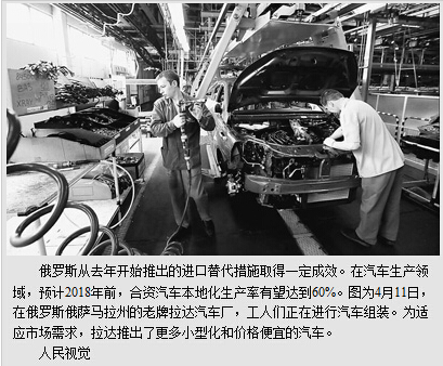 据悉,从去年开始陆续推出的进口替代措施已经初见成效。以汽车行业为例,2015年俄国产汽车在国内市场份额提升超过10%。根据俄汽车生产商与外国汽车生产商达成的协议,在2018年前合资汽车本土化率有望达到60%。以拉达汽车为代表的俄罗斯老牌汽车厂也调整生产规划,加紧制造适应市场需求的小型汽车。