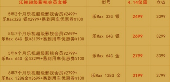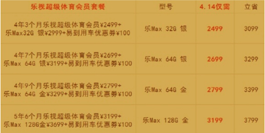 第三,乐Max各版本全部现货发售,分为乐视超级影视会员套餐和乐视超级体育会员套餐两个大类,每一类下面都提供4种套餐供选择,最低也可以省下3099元,最高立省3799元!优惠力度十分诱人。这里要推荐的无疑是乐Max128G金版本的套餐了,无论配合6年7个月的影视会员,还是5年6个月的超级体育会员都不能再划算了。