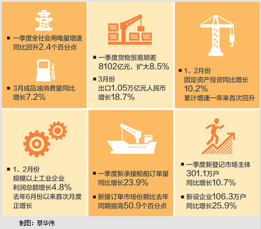 好消息还不止于此。来自海关的消息表明,一季度出口逐月回稳向好,其中3月份出口1.05万亿元人民币,增长18.7%。尽管今年外贸形势依然严峻复杂,下行压力仍然较大,但促进外贸发展的积极因素正在不断积聚、积累,随着稳定外贸增长各项措施逐步落实到位,今年我国货物贸易进出口有望实现回稳。工业和信息化部装备司的最新统计显示,一季度造船新接订单量较大幅度回升,新承接船舶订单量742万载重吨,同比增长23.9%。前3月,我国造船完工量、新接订单量、手持订单量分别占世界市场份额的31.0%、83.2%和42.8%,其中新接订单市场份额比去年同期提高50.9个百分点。工商总局也发布数据,今年一季度,全国新登记市场主体保持了较快增长势头。前3个月,全国新登记市场主体301.1万户,比上年同期增长10.7%,注册资本(金)8.8万亿元,增长68.9%。除企业外,全国新登记个体工商户187.8万户,新登记农民专业合作社7万户。
