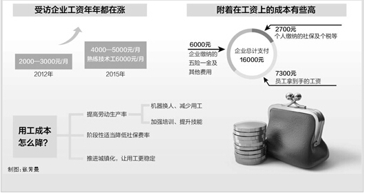 提高劳动生产率的另一个方面是加强培训、提升技能。但是,企业纷纷表示为难。王振举例说,金杭包装2014年时曾专门招了14名大专学历员工作为重点培养对象,并以12万元的年薪专为这14个人聘请了指导老师。没想到,年底就有6人提出辞职,到今年3月,14人中只有两个人还在公司。“培养一个走一个,企业哪还有动力培养员工?”企业建议国家增加制造业企业的培训补贴,既能够减轻企业的成本压力,也有助于提高劳动者的技能水平。“机器换人是个大趋势。换下来的员工怎么办?我们企业愿意做培训,让过去从事简单劳动的员工转为技术工,希望得到有关方面的支持。”鸿富锦负责人表示。
