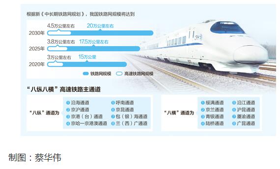 特别值得一提的是,在原规划“四纵四横”主骨架基础上,我国将形成以“八纵八横”主通道为骨架、区域连接线衔接、城际铁路补充的高速铁路网。