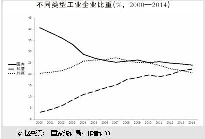 经验事实之一:国有企业在工业企业中的比重显著下降,民营企业比重持续上升。从上世纪90年代开始,我国允许国内民间资本和外资参与国有企业改组改革,为非公有制经济较快发展提供了空间(见右图)。从2000年到2014年,民营企业在工业企业总资产中的比重上升了19.2个百分点,达到22.3%;国有企业的比重则不断下降,从40.6%下降至当前的24%。不同类型企业共同发展,产生了良好的竞争氛围和外溢效应,有效提高了经济活力。十八届三中全会以来,混合所有制已被确立为新时期国企改革的主要方向,通过引进民间资本改善国企的治理结构,提升国企效率。