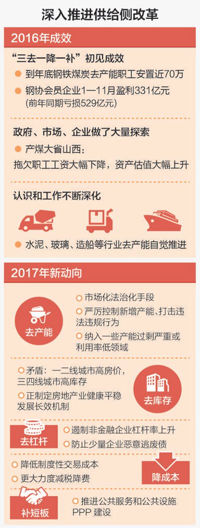 2016年,作为经济社会发展的一条主线,供给侧结构性改革有力有序地推进,“三去一降一补”的重点任务已经取得初步成效。其中,去产能的年度任务提前超额完成,包括钢铁4500万吨,煤炭2.5亿吨,至去年年底钢铁、煤炭去产能安置的职工已经接近70万。