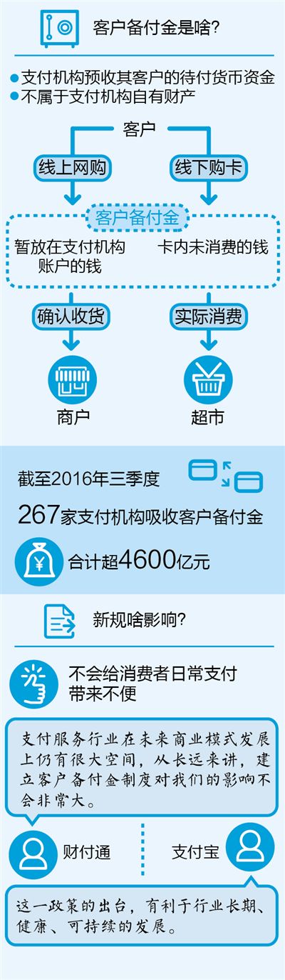 这位负责人表示,实施客户备付金集中存管,只是将支付机构存放在备付金存管银行中的部分资金交存到指定机构专用存款账户,其他流程没有变化,不改变原有备付金银行与支付机构之间的权利和义务。客户备付金作为商业银行存款的一部分,统一纳入商业银行存款准备金交存基数,对于交存至专用存款账户的客户备付金,将从商业银行的存款准备金交存基数中扣除。客户备付金集中存管后,不会给消费者日常支付带来不便。