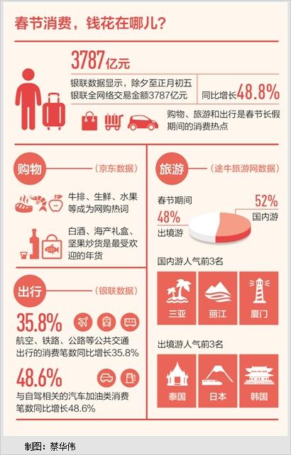 中国银联数据分析师陈汉介绍,从今年春节刷卡消费的构成来看,购物、旅游和出行等日常类消费依然是春节长假期间的消费热点,春节长假前6天日常类消费笔数较去年同期增长15.6%,高于整体消费增幅。