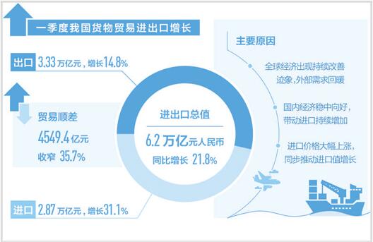 一季度进出口总值6.2万亿元,同比增长21.8%