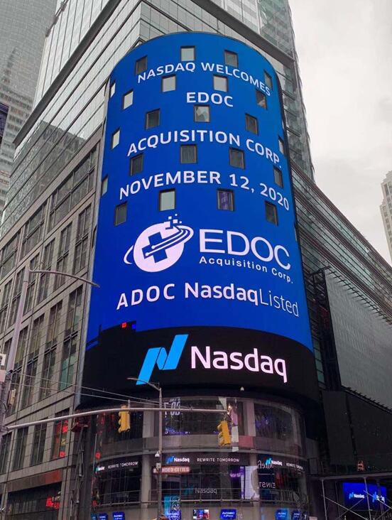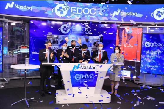 2020年11月12日,美国东部时间9时,Edoc Acquisition Corp.在美国纳斯达克主板成功上市。Edoc Acquisition Corp.股票代码为ADOC。Edoc公司CEO陈凯丰、纳斯达克全球资本市场业务负责人兼亚太区主席鲍勃•麦库伊、公司投资人和高管等嘉宾参加了现场敲钟仪式,Edoc中国区多位合作伙伴通过视频送上祝福,并在中国当地举行相关庆祝活动。