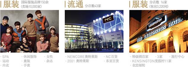 衣恋集团坐拥多家NC百货店以及高档品牌的OUTLET。其中NC百货是韩国年轻人购物最爱去的地方。NC百货以远低于国内其他百货店的价格为顾客提供43个购自于世界各地的国际知名品牌产品,其中衣恋集团旗下品牌服装品牌,Teenie Weenie,Rome,Paw in Paw等中国人气产品应有尽有。更首创免税店式百货店形式,不仅可以更性价比的价格购买国际品牌产品,更可享受到享受高达商品价格8%的退税优惠政策,是首屈一指的时尚专门百货店。