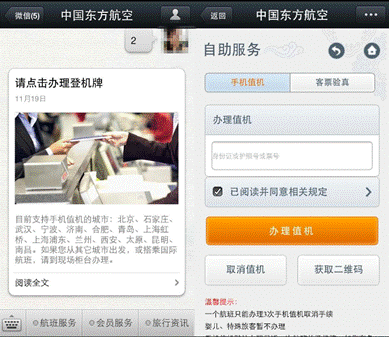 另外,无论通过何种方式选择购票,用户均可直接通过微信办理自助值机服务,登机牌会以二维码的形式发送至用户手机。用户登机时只需出示身份证和二维码登机牌即可。同时在座位选择,餐食要求上也均可以提前选定。目前支持微信办理登机牌的机场已全面覆盖北京、上海等主流机场,真正解决了如何让用户更便捷出行的航空问题。