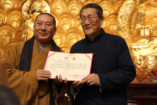 讲座期间,武进区佛教文化研究会正式启动,楼宇烈教授接受了研究会会长、宝林禅寺方丈慧闻法师的特聘邀请,担任顾问,并接受了聘书。