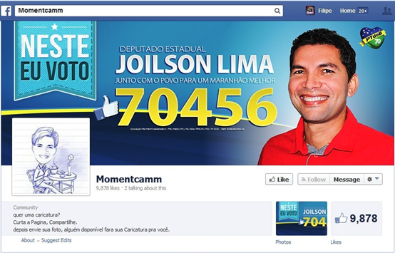 该竞选人的Facebook主页显示,其昵称与魔漫相机的英文名(Momentcam)极其雷同,本人不但亲自使用了魔漫头像,还在签名中以“为选民制作漫画头像”为“诱惑”条件来为自己拉票,“笼络”选民。从实时的结果来看,这种新颖的竞选方式的确很奏效,让竞选人赢得了大量网民的点赞、认可。