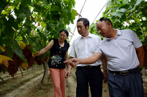 日前,湖南岳阳县新墙镇万亩葡萄长势喜人,前来采访的记者络绎不绝。图为人民日报记者夏珺主任在岳阳县委宣传部长喻飞跃陪同下来到清水村葡萄基地调研,村支书李大树向他们介绍葡萄生长情况。