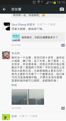 署名“朱元帅“的网友自发出这条微信已经5天,可是众网友纷纷表示,从未收到任何所谓的”雾霾补贴“,”朱元帅“也像人间蒸发了一般,无任何消息,那么”朱元帅“发此条微信的目的何在?难道真像网友说的那样炒作自己吗?