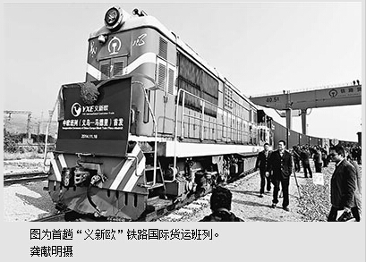 本报北京11月18日电 (记者顾春)18日,首趟“义新欧”铁路国际货运班列从浙江义乌国际商贸城始发,运载82个标箱出口小商品,驶往西班牙首都马德里市。“义新欧”(义乌—马德里)铁路班列经新疆进入哈萨克斯坦,再经俄罗斯、白俄罗斯、波兰、德国、法国,最后到达西班牙马德里,全长13000多公里,几乎横贯整个欧洲,是所有中欧班列中最长的一条。据悉,“义新欧”班列是浙江省融入丝绸之路经济带和21世纪海上丝绸之路国家战略建设的重要平台。义乌市委书记李一飞表示:“义乌将加强与沿线国家和地区的经贸合作,大力发展进口贸易,把义乌打造成为丝绸之路经济带的新起点。”