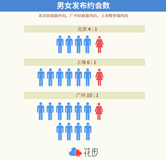 在主动约会这一习惯中,男生明显比女生更积极,从平均数据来看,男生每发布8条信息,女生才会发布1条信息。而男女的差异,细化到城市内部则更明显,北京男生平均发布4条信息,女生就会发布1条信息,在上海这个比例是6比1,而广州虽然约会积极度很高,但似乎仅限于男生,男生平均发布10条信息女生才会发布1条信息,相比而言,在约会方面,北京女生更外向主动,广州女生更内向。